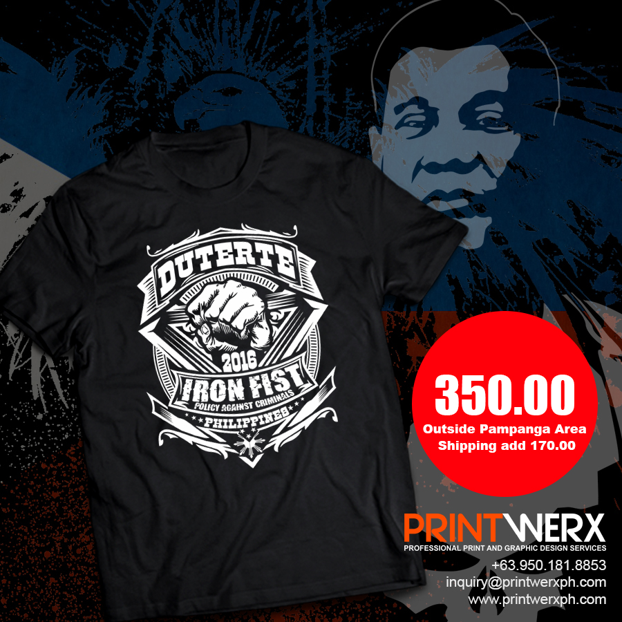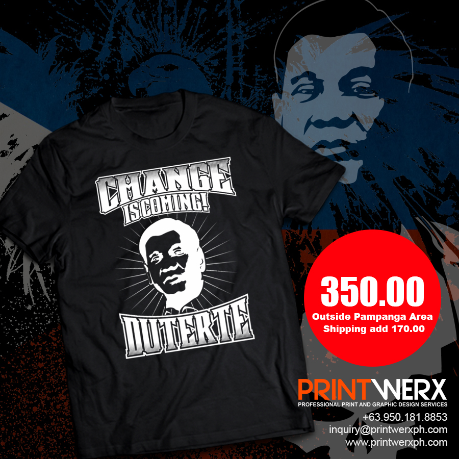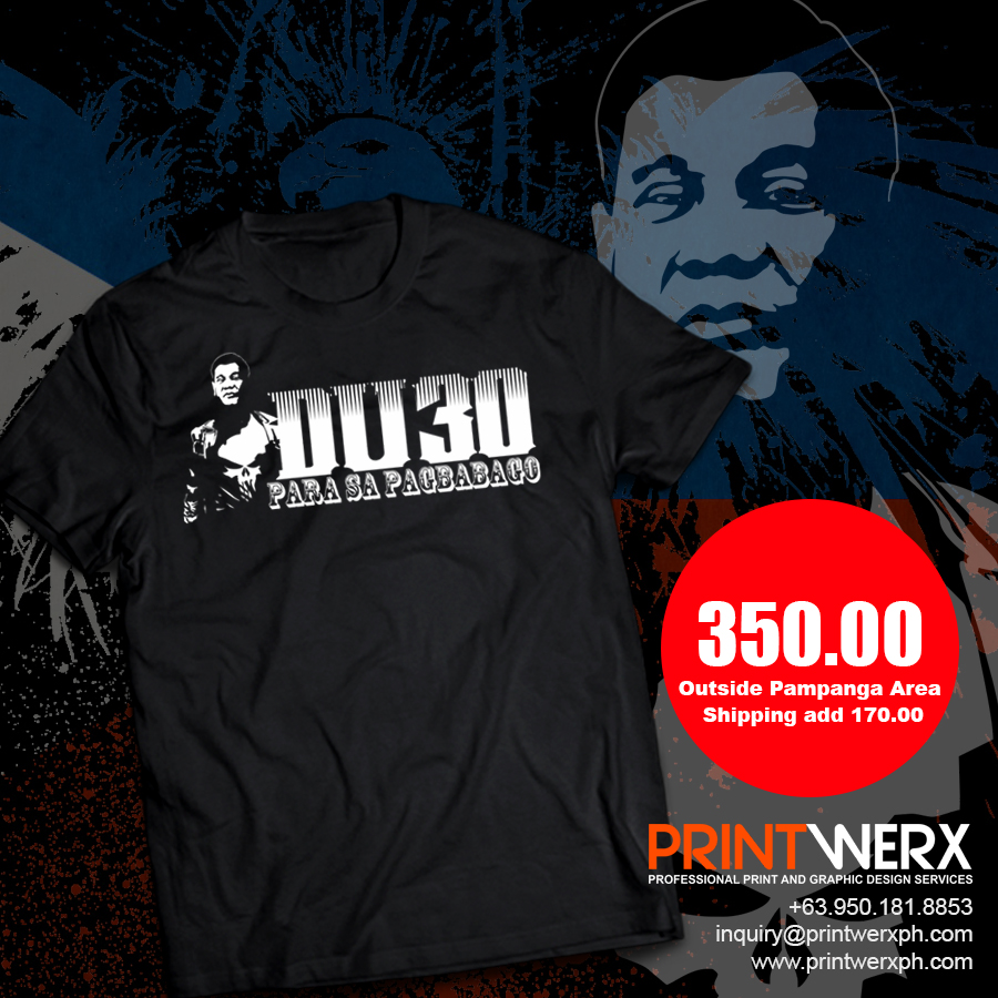 This Dutere for President 2016 T-Shirt is printed using high quality material on a cotton black t-shirt. This T-Shirt is a Made to Order basis, give us 2-3 days to print and ship your order.
